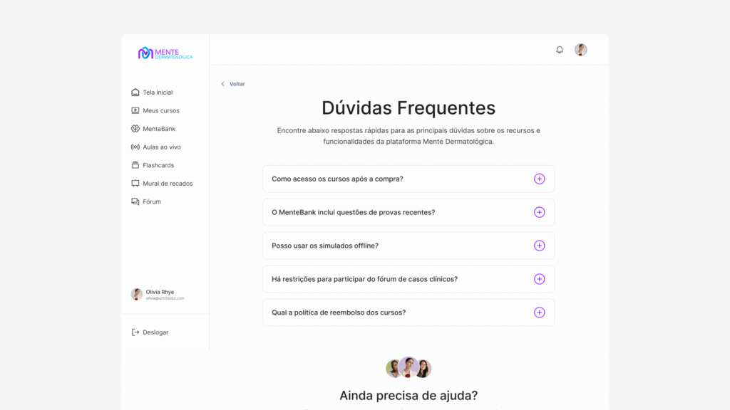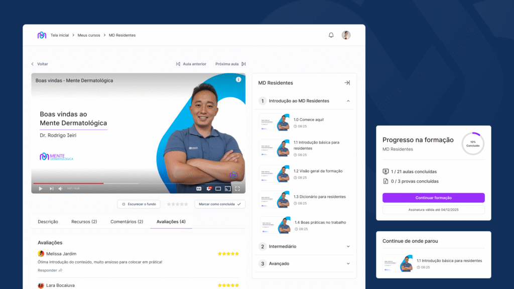 Aulas, trilhas, avaliações, certificados e gestão de turmas. Experiência fluida para alunos e equipe acadêmica.